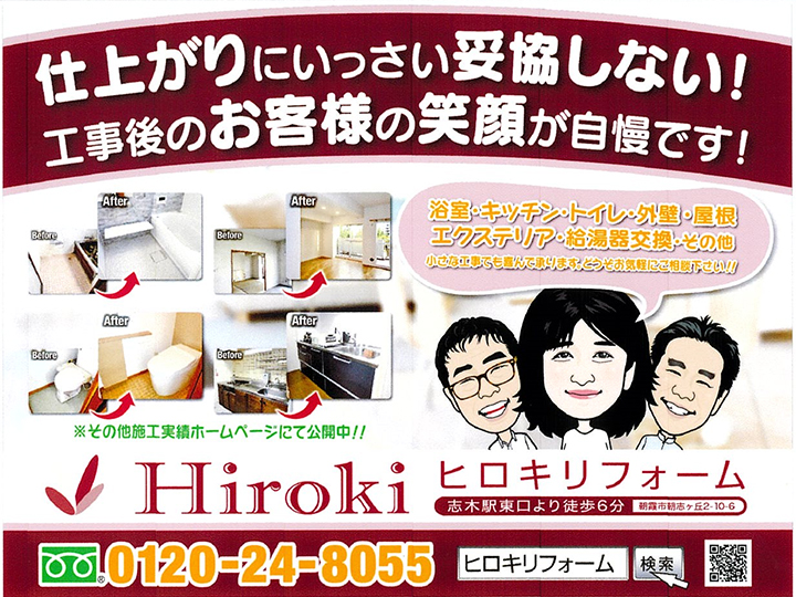 お問い合わせ お見積り 無料見積り・相談 電話で見積り・相談 0120-24-8055 【受付】9:00~18:00【定休日】日曜・祝日 電話で見積り・相談 HOMEイベント・チラシ情報チラシ情報志木駅東口にヒロキリフォームの看板が設置されています! 志木駅東口にヒロキリフォームの看板が設置されています!(終了しました) ヒロキリフォームの看板が志木駅東口に掲載されています!その看板を見てこのページにたどり着いた方、ご相談は無料ですのでぜひお気軽にお問い合わせください。以下のボタンからすぐにお問い合わせできます! 会場 ヒロキリフォーム志木駅東口店 会場住所 〒351-0035埼玉県朝霞市朝志ヶ丘2-10-6 一言 志木駅東口にヒロキリフォームの看板が設置されています。ぜひご覧ください! アクセスマップを確認する チラシ情報一覧はこちら イベント・チラシ情報一覧はこちら ヒロキリフォームについて 選ばれる理由 会社案内代表挨拶会社概要アクセスマップ スタッフ紹介 施工事例 施工事例一覧 キッチン お風呂 トイレ 洗面所 内装 自然素材 外装 リノベーション その他 お客様の声 お客様の声一覧 カテゴリーなし イベント・チラシ情報 イベント・チラシ情報一覧 イベント情報 イベント 相談会 チラシ情報 リフォームメニュー 水まわりセット マンション用 リーズナブルプラン ¥485,000(税込) お風呂 TOTO WS Tタイプ(マンション向け) ¥277,000(税込) トイレ TOTO ピュアレストQR ¥89,000(税込) 洗面化粧台 クリナップ ファンシオ ¥153,000(税込) キッチン クリナップ ラクエラ I型 ¥424,000(税込) 給湯器 Rinnai 給湯専用 給湯器 16号 ¥48,180(税込) ガスコンロ Rinnai メタルトップシリーズ ¥60,000(税込) 玄関ドア LIXIL リシェント 勝手口ドア H型 断熱仕様 シリンダーレス ¥242,000(税込) レンジフード Rinnai TLRシリーズ ¥88,000(税込) 改装リフォーム 改装リフォーム 6帖和室から洋室に ¥262,000〜(税込) 内装リフォーム クロス貼替(6帖)エコノミータイプ ¥60,600〜(税込) リフォームメニュー一覧 水まわりセット お風呂 トイレ 洗面化粧台 キッチン 給湯器 ガスコンロ 玄関ドア レンジフード 改装リフォーム 内装リフォーム お役立ち情報 水まわりまるごと3点セット 住宅省エネ2026キャンペーン 先進的窓リノベ2026事業 みらいエコ住宅2026事業 給湯省エネ2026事業 賃貸集合給湯省エネ2026事業 自宅にいながら温泉気分 ファーストクラス浴槽 シンラ(SYNLA) LINEで簡単相談・見積もり リフォームの流れ お問い合わせ お問い合わせ 無料お見積もり