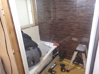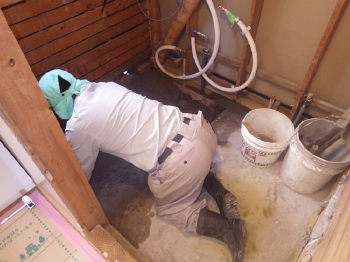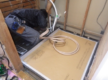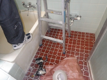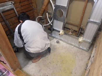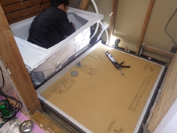 配管工事も完了し、次はいよいよ新品の浴槽を運び入れ、組み立てを行っていきます。 |