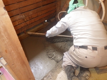 | ザラ板の解体も完了し、既存の浴槽も綺麗に解体されました。 土台が染みているように見えますが、こちらは防腐材を塗布した跡です。 このように細かい点も配慮させていただきます。 |