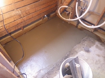 | 乾燥した土間コンの上に、ユニットバスの土台を設置していきます。 | 設置された土台の上には、断熱仕様の床材を乗せていきます。 施工前のタイル床とは異なり、冬場でも暖かく過ごせる床材になっています。 |