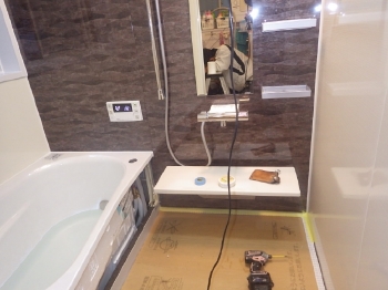 | 棚やシャンプーホルダー、自動湯沸かし器等の設置も完了いたしました。 また浴槽にはお湯を張り、水漏れなどの問題がないかチェックを行います。 |