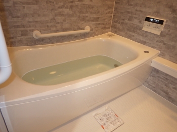 | こちらが施工後のお写真です。 ゆったりとくつろいでいただける、広い浴槽です。 今回の浴槽はTOTOのWGマンションリモデルになっており、人工大理石で出来ているため高級感も出ていますね。 |