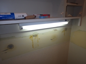 既存の洗面台に設置されていた大きな鏡は残しますので、外していきます。鏡を外すと照明の蛍光灯が姿を現しました。 |