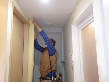 | 水栓の位置が上に来るために邪魔になる板を撤去後、小口テープにて化粧をせいていきます。 |