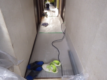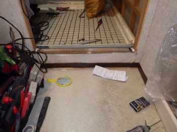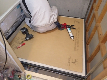 次に、浴槽の土台となる部分を床面に設置していきます。 | 浴槽土台の上に新しい床面を張り終わりました。 |