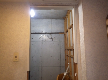ドア枠の解体作業が完了しました。 同時進行で、浴室の壁面も解体していきます。 |