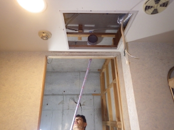 | 浴室壁面と天井の解体が完了いたしました。 | 次に、既存の浴槽とタイル張りの床面の解体作業に移ります。 | 今回は3室同時に換気できる換気扇を設置していきます。 |