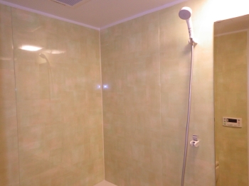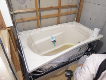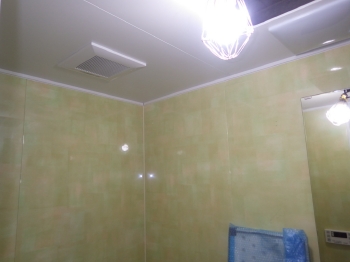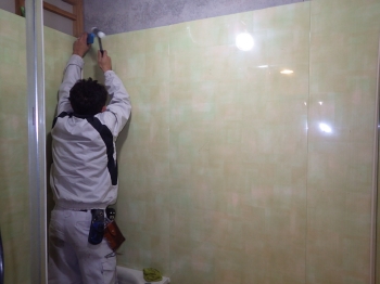 | いよいよ新しい浴槽を組み立てていきます。疲れた身体をゆっくり休められそうな広々とした浴槽ですね。 | 壁面には薄いグリーン色のパネルを張っていきます。 | 3室同時換気がついている天井も設置されました。真っ白で清潔感があります。 |