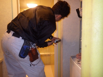 | 浴室のドア枠も、新しいものを取り付けていきます。 |
