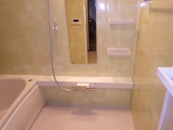 こちらが浴室設備まわりのお写真です。 「あったらいいな」を叶えてくれる、水栓のちょっとした棚が嬉しいですね。 シャンプーホルダーも設置され、施工前は小さかった鏡も大きいものに交換されました。 機能面でも便利にリフォーム完了です。 |