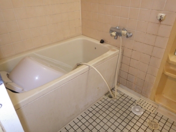 | こちらが施工前のお風呂の様子です。 浴槽のまたぎは高めで、お風呂に入るにも一苦労しそうな古い浴槽でした。 |
