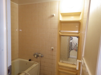 浴室の床や壁はタイル張りになっており、目地の汚れが目立っております。 冬場は浴室全体が一層寒くなりそうな印象を受けますね。 |