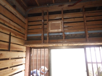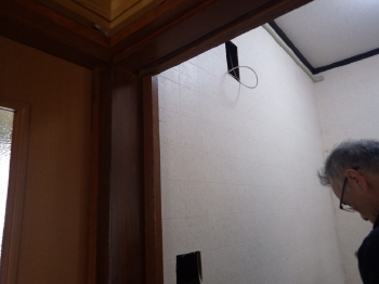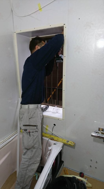 今回のリフォームで出窓が開けづらくなることが予想されたため、あらかじめスペースに加工をしています。リフォームには何気ないひと工夫が大切です。 | 洗面所の壁を一部開口し、浴室換気のリモコンを設置していきます。 |