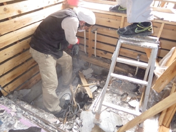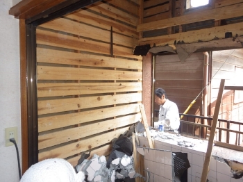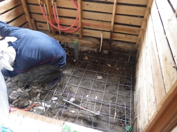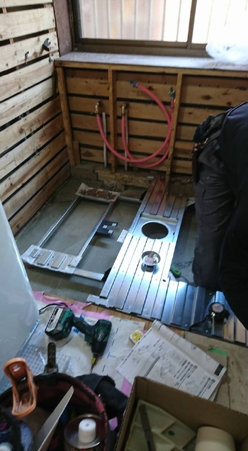 | 既存浴槽の撤去後、土間打ちの為に金属メッシュを敷いていきます。 |