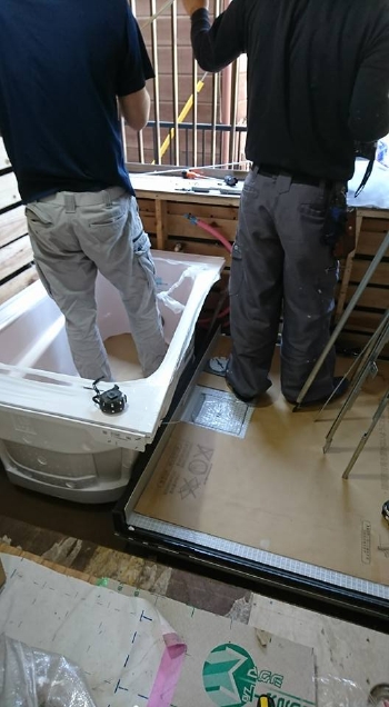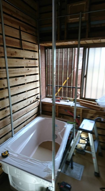 | 土間コンが乾いたのち、ユニットバスの土台を設置していきます。 | 土台の上には浴槽と床材を敷いていきます。いよいよ浴室らしくなってきました。 | 次にバスパネルを張っていくための枠を浴室内に組んでいきます。 |
