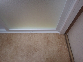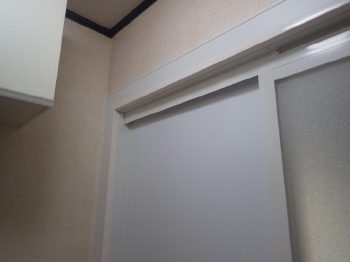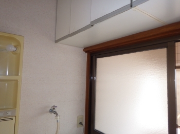 最後に洗面所の床面CFシートリフォームに移ります。まずは既存CFシートを剥がす作業です。 | 浴室のドア高が高くなったので、既存の吊り戸棚を移設しました。 |