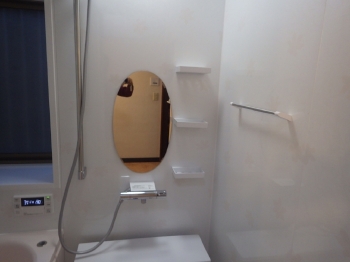 お施主様こだわりの楕円形の鏡は今回オプションでご準備させていただきました。 シャンプーなどを置く台も付いており、毎日のお風呂に「使いやすさ」をプラスしたリフォームになりました。 |