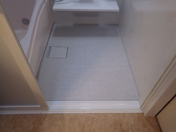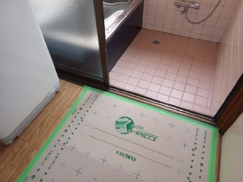 | 浴室出入り口のスライドドアも化粧板が付けられて施工が完了です。 | 床面も綺麗なCFシートが張られました。 ツルツルで気持ちよさそうですね。 |