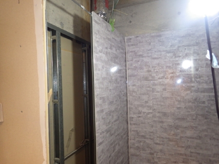 次にユニットバスの土台を設置していきます。 いよいよ新しいユニットバスを運び入れ、組み立てを行っていきます。 壁面は高級感のあるバスパネルを貼っていきます。