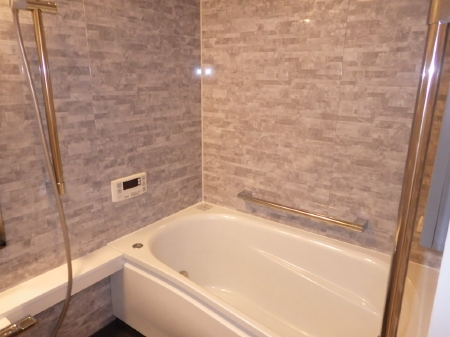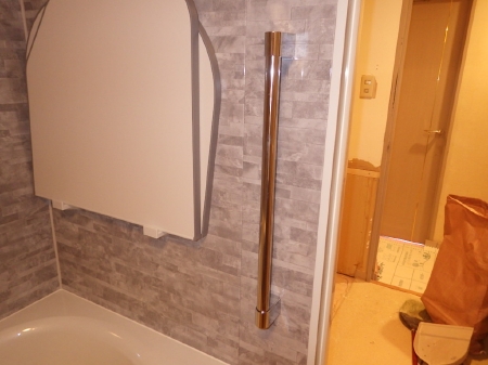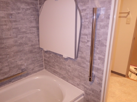 シャワーを取り付けられる手すりや大きな鏡など、機能面も満点のお風呂に生まれ変わりました。 浴室出口のドア付近にも頑丈な手すりがありますので、万が一の際も安心なお風呂となっています。