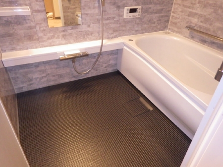 浴室床は高級感のあるブラック、お掃除も楽ちんな素敵なお風呂にリフォームされました。