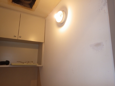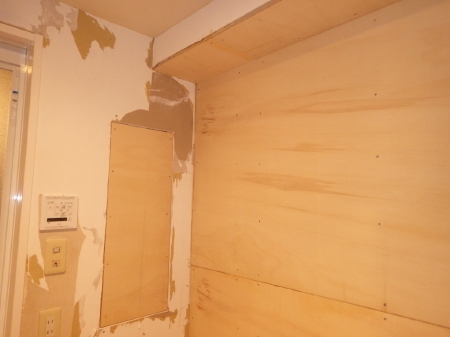 取り付けられていた大きな鏡も撤去されました。洗面化粧台の横には大型の収納を設置していきます。 収納を取り付けるに際し強度を保つため、壁を一部開口し、下地の補強を行っていきます。 下地補強完了後に、綺麗なクロスを貼り直していきます。