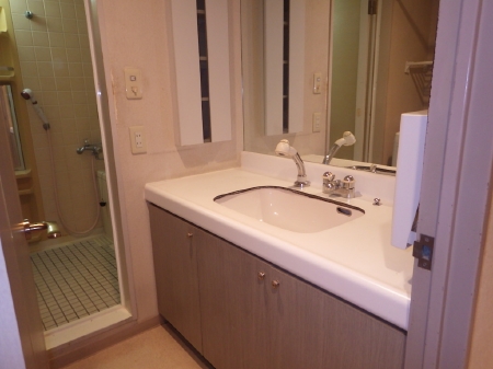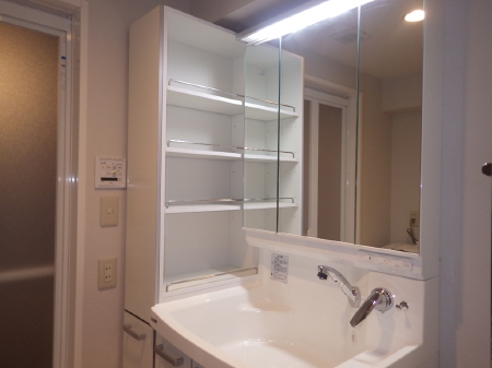 大きな鏡と明るい照明、洗面化粧台横の収納も大容量となっております。