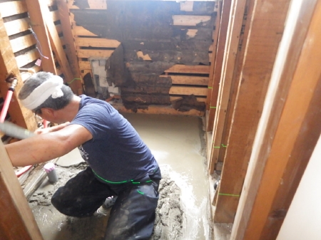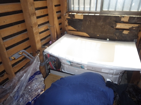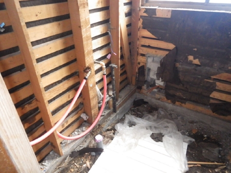 | 銀色に延びているダクトは浴室換気のダクトになります。この後外壁にはベントキャップを取り付けていきます。 | 浴室の土台は経年によりひどく劣化、腐食しておりましたので、差し替えを行っていきます。 | 職人により既存の土台を削って解体していきます。 |
