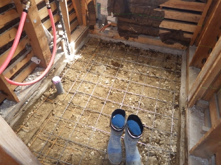 | 浴室床がここまで解体完了いたしました。 次に土間コンを打設していきますので、コンクリートの強度を増すために鉄筋メッシュを入れました。 |