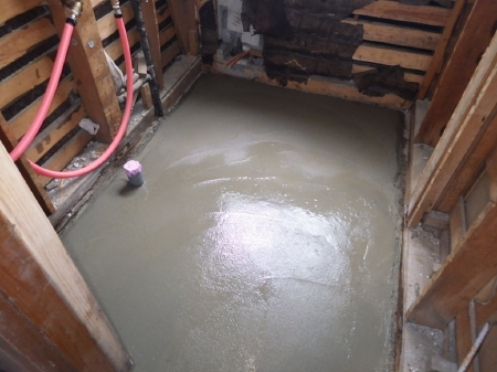 次に、鉄筋メッシュの上から土間コンを流し込んでいきます。 |