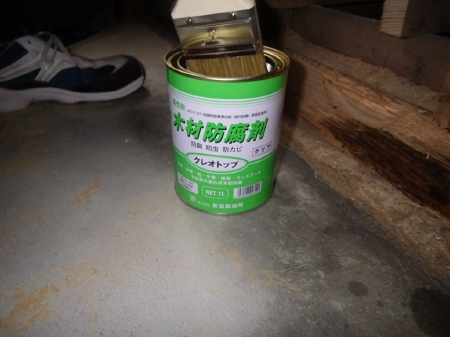 こちらは土台に塗布する防腐剤です。 | 水まわりの土台は腐食しやすいので、入念に土台へ防腐剤を塗布していきます。 |