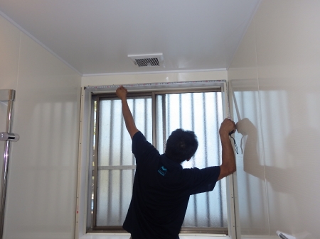 | 合わせて天井パネルと浴室換気も設置作業が進んでいきます。 | 今回のリフォームでは清潔感のあるアイボリーのパネルを全面に貼っていきます。 | 浴室窓枠も綺麗なものへ一緒に交換していきます。 |