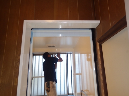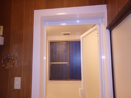| 浴室リフォームもいよいよ大詰め、最後に浴室ドアの施工に移っていきます。 | こちらのお宅は浴室ドア枠に既存の壁面が干渉する造りになっておりましたので、部材を切り出し調整を行っていきます。 | 新しいドアの額縁も綺麗に収まり、これにて浴室リフォームは完了となります。 |