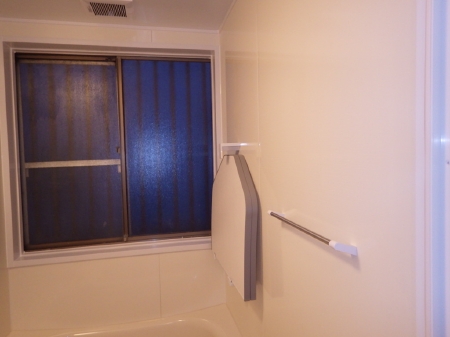 | 次に浴室カウンターや鏡などを設置していきます。見た目と使いやすさ、両面で嬉しいリフォームが進んでいきます。 | 浴槽の蓋は壁に収納できるものになっています。 使い勝手も抜群ですね。 |