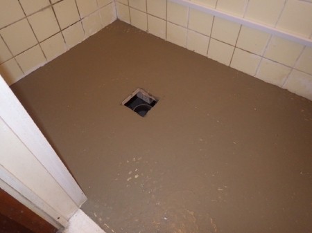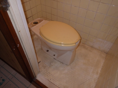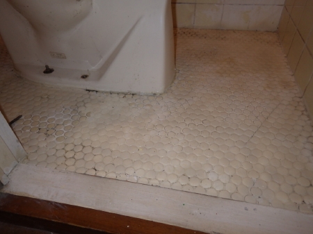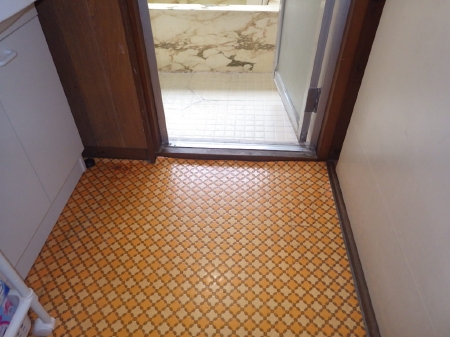 | こちらは浴室ドア付近のお写真になります。 | 施工前のトイレは長年お使いいただいた結果汚れきっておりました。 | トイレの床もこの通り汚れが見られます。こちらも合わせて貼り換え、気持ちよい空間にしていきます。 |