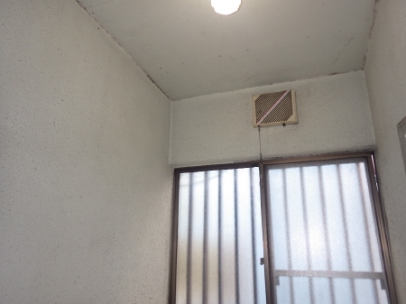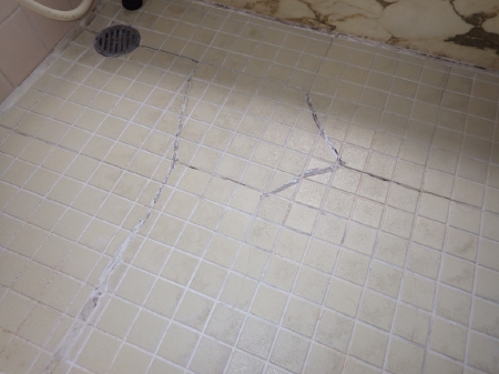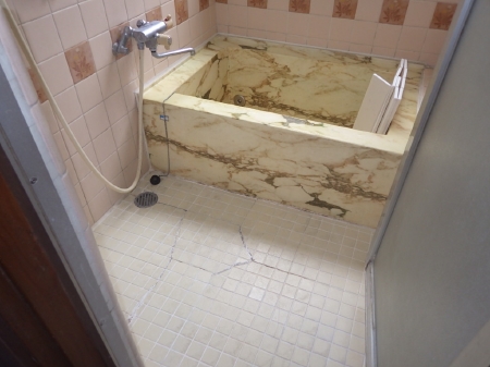 浴室の床には大きなひびが入っております。ケガの恐れもあり危険な状態でした。 | 壁面や天井には、経年による傷みが随所に見受けられます。 |