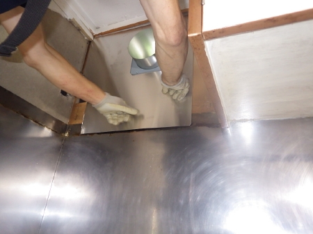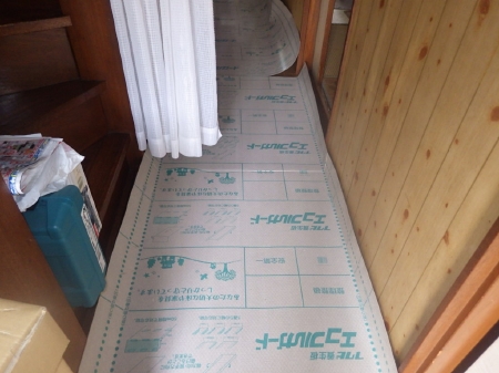 | 床面がならされたら、CFシートを貼っていきます。これだけでも随分と綺麗な印象が出てきました。 | 新しいトイレを取り付け、トイレリフォームも完了です。 | 最後にキッチン、長年の油汚れがべったりのレンジフードを撤去していきます。 |