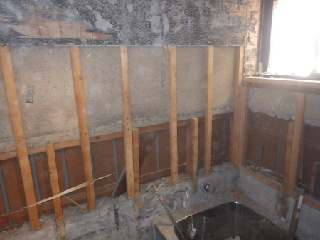 | 施工に入る前に、搬入物などでお家に傷がつかないよう、廊下などを入念に養生していきます。 | 続いて浴室天井とタイル張りの壁面、床の解体を行っていきます。 | ステンレス製の浴槽の解体作業が完了いたしました。在来工法からの解体は労力も掛かります。 |