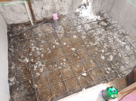 | 発生した瓦礫を撤去したあとは、床に金属メッシュを入れて土間コンクリートを打つために頑丈な床へ作り替えていきます。 | 次に金属メッシュの上からコンクリートを流し込んでいき、しっかりと乾燥をさせます。 | 乾いた土間コンクリートの上に、浴槽の土台を運び入れ設置していきます。 |