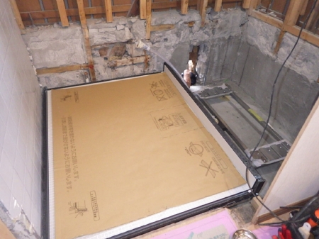 土台の上に浴室の床材を敷いていきます。 ここからどんどんとお風呂のリフォームが進んでいきます。 |