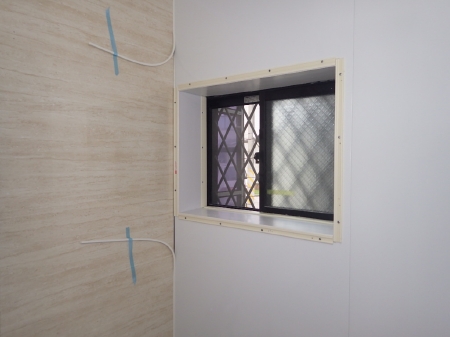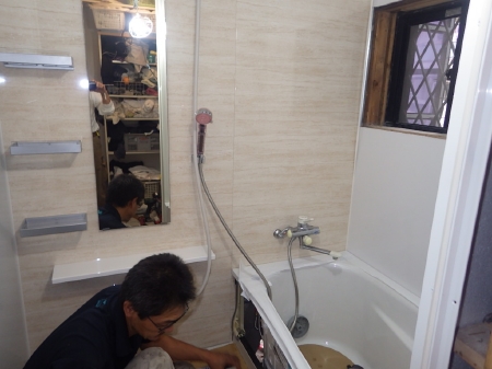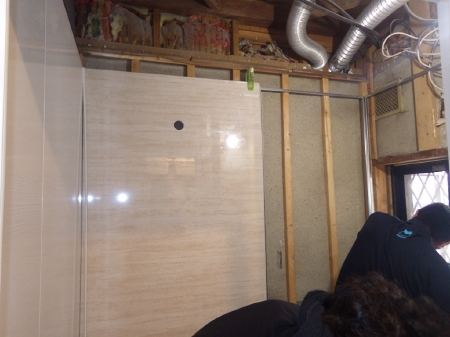 | お家の外では職人によって壁面や天井の形状に合わせたパネル加工が進んでいきます。 | 加工されたバスパネルを壁面に貼っていきます。木目調で暖かい印象を受ける素敵なパネルですね。 | カウンターや鏡などが取り付けられ、どんどん華やかな浴室に変わっていきますね。 |