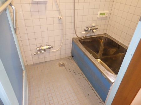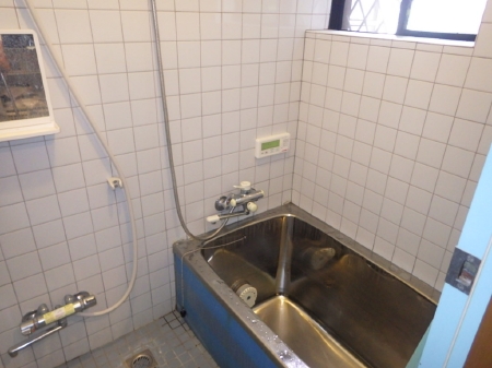 | こちらが施工前の浴室のお写真です。 浴槽はステンレス製で、全体的に冷たい印象を受けます。 |