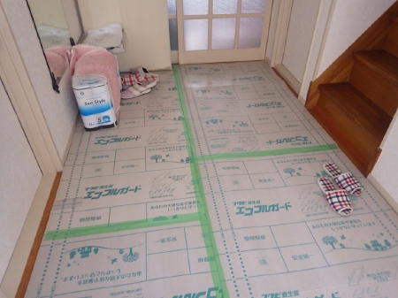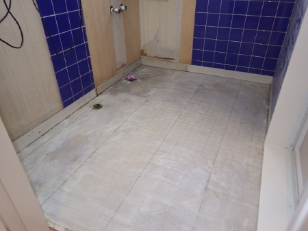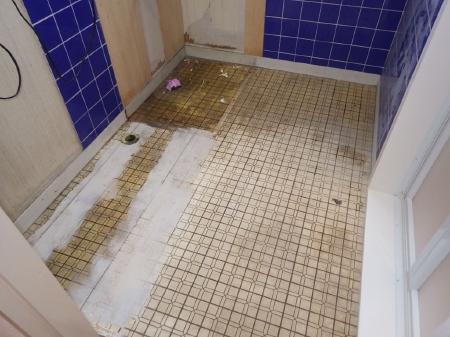 | ここからは洗面化粧台の交換リフォームに移っていきます。まずは既存の洗面化粧台を解体、撤去していきます。 | 既存の壁面に貼られたタイルと厚みを合わせる為にベニアを貼り、平らにしていきます。 | 次に洗面所の床を剥がしていきます。 見えないところにもしっかりと汚れが溜まっておりました。 |
