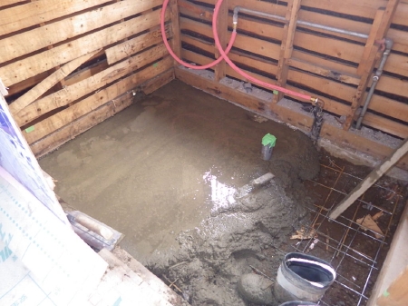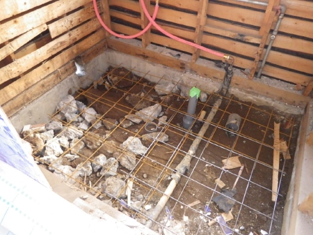 | 給排水を取り付けたのち、土間コンクリートを打設するために金属製のメッシュを入れていきます。 | メッシュを入れ強度を上げたところに、コンクリートを流し込んでいきます。 |