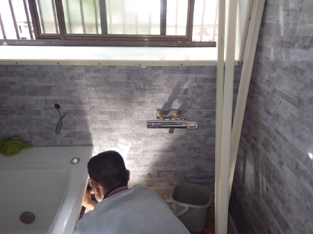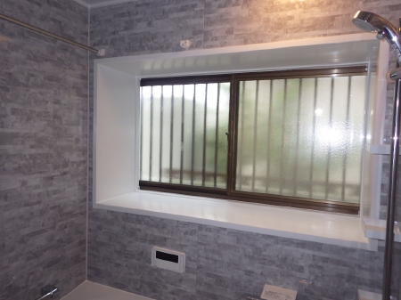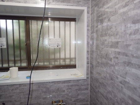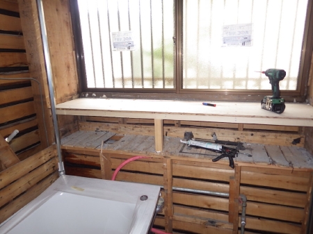 | 職人により、浴槽のサイドパネルの取り付けとシャワーなどの設置が行われていきます。 | 出窓の枠も作り替え、お風呂のリフォームがいよいよ大詰め、仕上げの段階です。 |