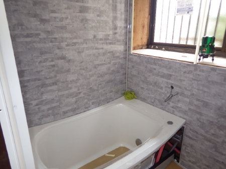 | 浴室出窓の窓枠を施工中のお写真です。 | 壁面には高級感の溢れるバスパネルを貼っていきます。 | 浴室天井には換気機能も設置、合わせてドア枠も施工が進んでいきます。 |