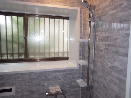 向かって右側の壁にはシャワーや収納棚が設置されています。 施工前と比べて大変使いやすい浴室に生まれ変わりましたね。 |