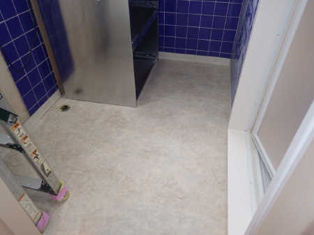 | 床を剥がし終えた後は、クッションフロアシートを貼っていくために接着剤を塗布していきます。 | いよいよ新しいクッションフロアシートを床面に貼っていきます。 | 床面の施工後には、新品の洗面化粧台を設置していきます。 |