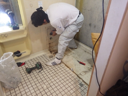| 最初に既存浴室の解体を行っていきます。 | 同時進行で壁面パネルの解体も行います。 | 浴槽、床壁の撤去が完了致しました。 |