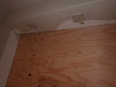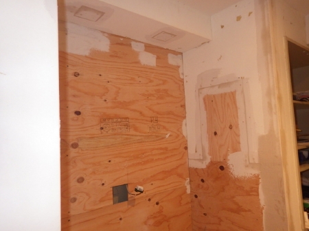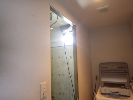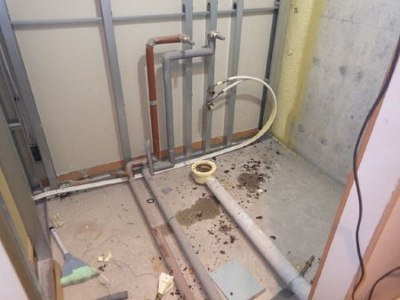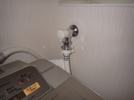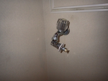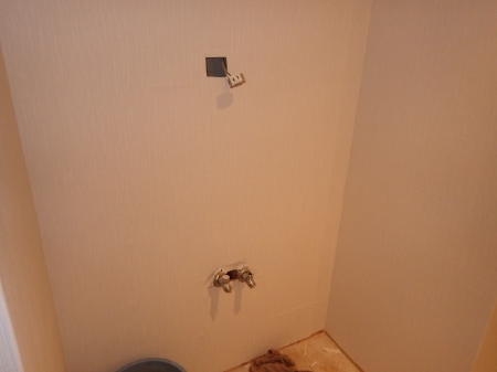 | 上部のライトも今後使用しないので、同様に埋めていきます。 | 下地の補強と収納スペースの埋め戻し作業が完了いたしました。 | こちらは洗濯機を繋げる水栓です。 リフォームに伴い緊急止水弁付きのものへ交換を行います。 |